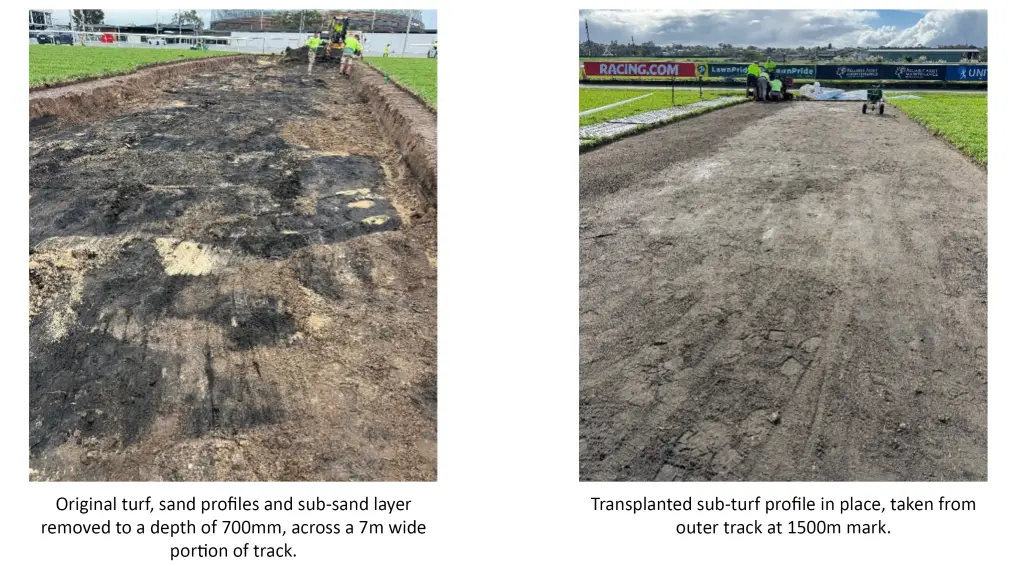 The work, undertaken by Evergreen Turf Group, involved removing a section of the track around the 150m mark, to a depth of approximately 700mm and a width of 7m.